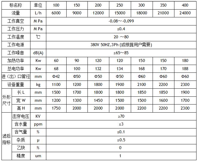 立式雙級絕緣油真空凈油機(進口品牌泵)參數(shù):