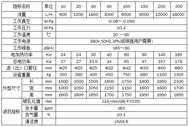 T系列汽輪機(jī)透平油防爆型真空濾油機(jī)工作參數(shù):