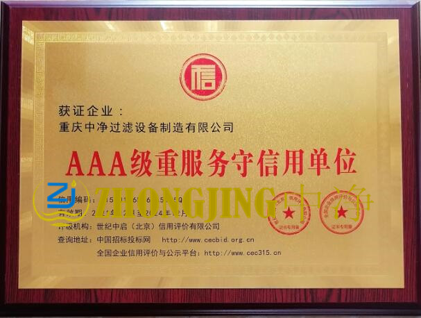 以上內容就是講的關于重服務守信用證書:想了解更多相關的內容,請持續關注重慶中凈過濾設備制造有限公司網站,公司網編還會繼續更新真空濾油機相關的知識,歡迎來電咨詢與定制。